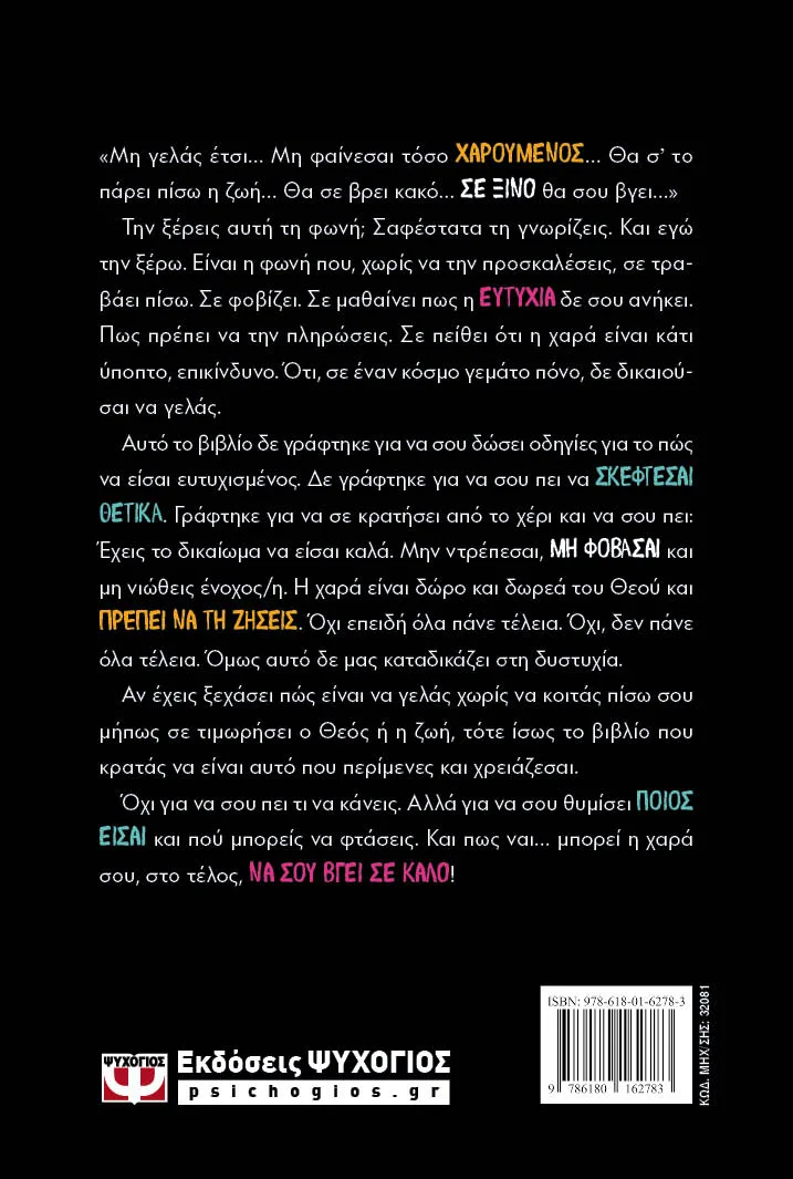 Αυτό το βιβλίο δε γράφτηκε για να σου δώσει οδηγίες για το πώς να είσαι ευτυχισμένος. Δε γράφτηκε για να σου πει να ΣΚΕΦΤΕΣΑΙ ΘΕΤΙΚΑ. Γράφτηκε για να σε κρατήσει από το χέρι και να σου πει: Έχεις το δικαίωμα να είσαι καλά. Μην ντρέπεσαι, ΜΗ ΦΟΒΑΣΑΙ και μη νιώθεις ένοχος/η. Η χαρά είναι δώρο και δωρεά του Θεού και ΠΡΕΠΕΙ ΝΑ ΤΗ ΖΗΣΕΙΣ. Όχι επειδή όλα πάνε τέλεια. Όχι, δεν πάνε όλα τέλεια. Όμως αυτό δε μας καταδικάζει στη δυστυχία.