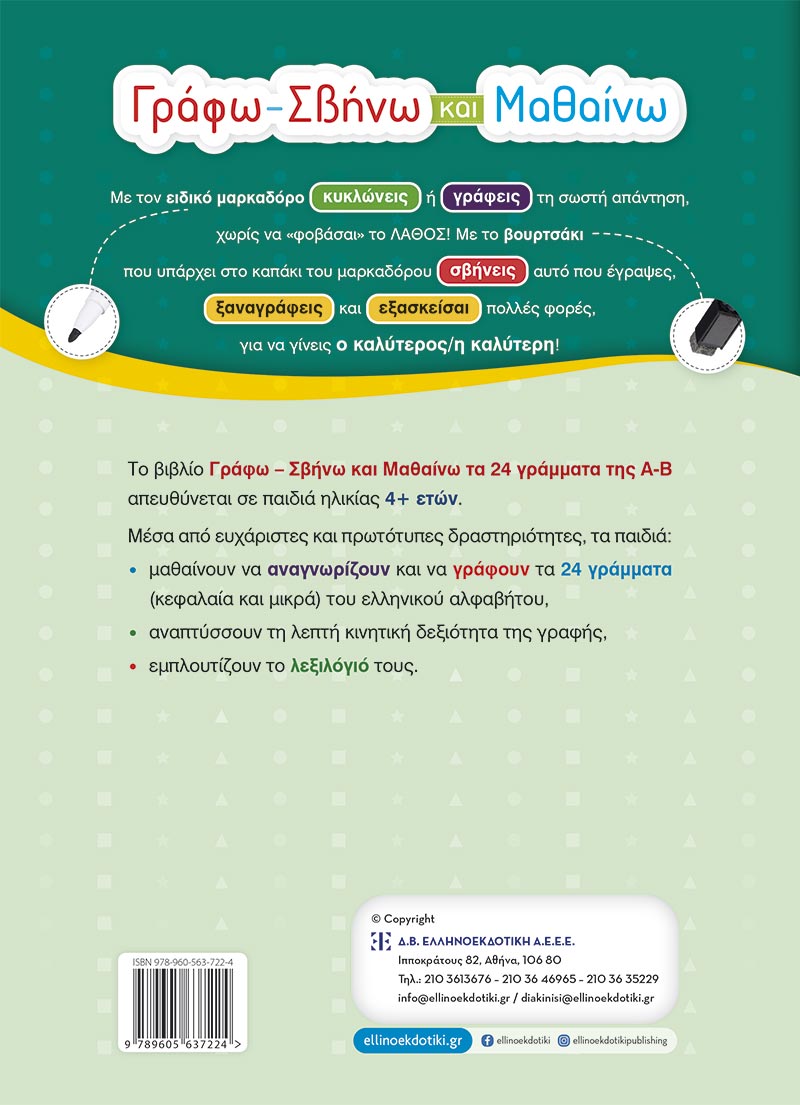 Το βιβλίο Γράφω – Σβήνω και Μαθαίνω τα 24 γράμματα της Α-Β απευθύνεται σε παιδιά ηλικίας 4+ ετών. Μέσα από ευχάριστες και πρωτότυπες δραστηριότητες, τα παιδιά: