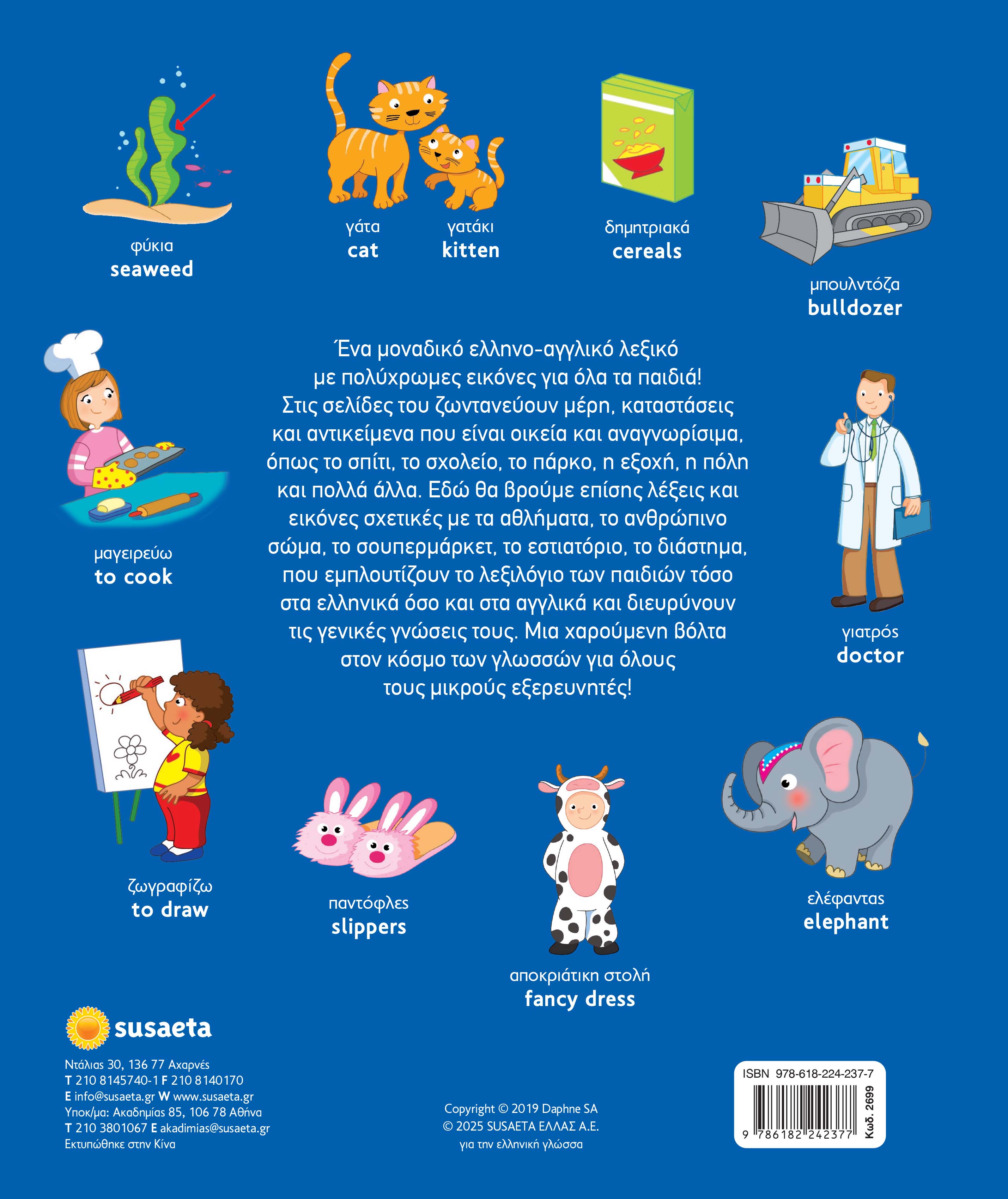 Ένα μοναδικό ελληνο-αγγλικό λεξικό με πολύχρωμες εικόνες για όλα τα παιδιά! Στις σελίδες του ζωντανεύουν μέρη, καταστάσεις και αντικείμενα που είναι οικεία και αναγνωρίσιμα, όπως το σπίτι, το σχολείο, το πάρκο, η εξοχή, η πόλη και πολλά άλλα. Εδώ θα βρούμε επίσης λέξεις και εικόνες σχετικές με τα αθλήματα, το ανθρώπινο σώμα, το σουπερμάρκετ, το εστιατόριο, το διάστημα, που εμπλουτίζουν το λεξιλόγιο των παιδιών τόσο στα ελληνικά όσο και στα αγγλικά και διευρύνουν τις γενικές γνώσεις τους. Μια χαρούμενη βόλτα στον κόσμο των γλωσσών για όλους τους μικρούς εξερευνητές!