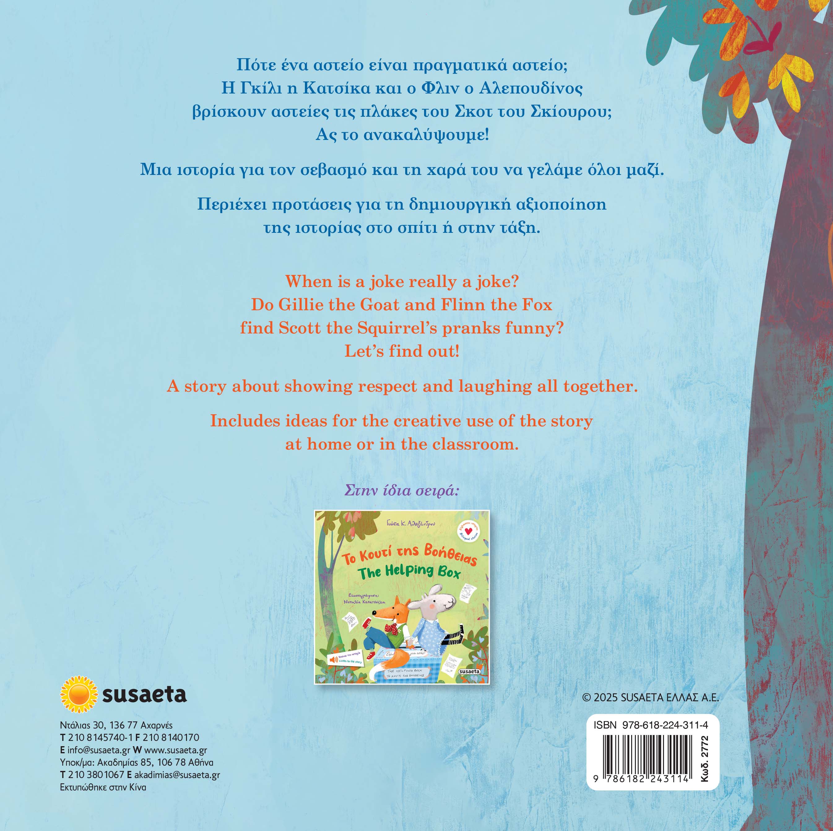 Πότε ένα αστείο είναι πραγματικά αστείο; Η Γκίλι η Κατσίκα και ο Φλιν ο Αλεπουδίνος βρίσκουν αστείες τις πλάκες του Σκοτ του Σκίουρου; Ας το ανακαλύψουμε! Μια ιστορία για τον σεβασμό και τη χαρά του να γελάμε όλοι μαζί. Περιέχει προτάσεις για τη δημιουργική αξιοποίηση της ιστορίας στο σπίτι ή στην τάξη.