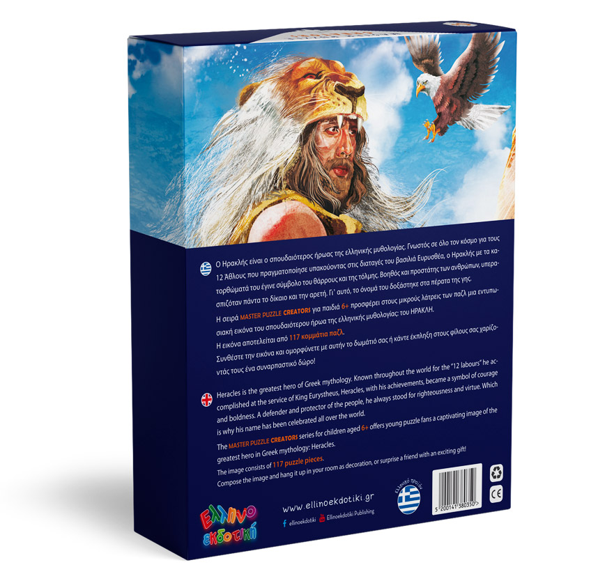 Heracles is the greatest hero of Greek mythology. Known throughout the world for the “12 labours” he accomplished at the service of King Eurystheus, Heracles, with his achievements, became a symbol of courage and boldness. A defender and protector of the people, he always stood for righteousness and virtue. Which is why his name has been celebrated all over the world.The MASTER PUZZLE CREATORS series for children aged 6+ offers young puzzle fans a captivating image of the greatest hero in Greek mythology: Heracles. The image consists of 117 puzzle pieces.Compose the image and hang it up in your room as decoration, or surprise a friend with an exciting gift!