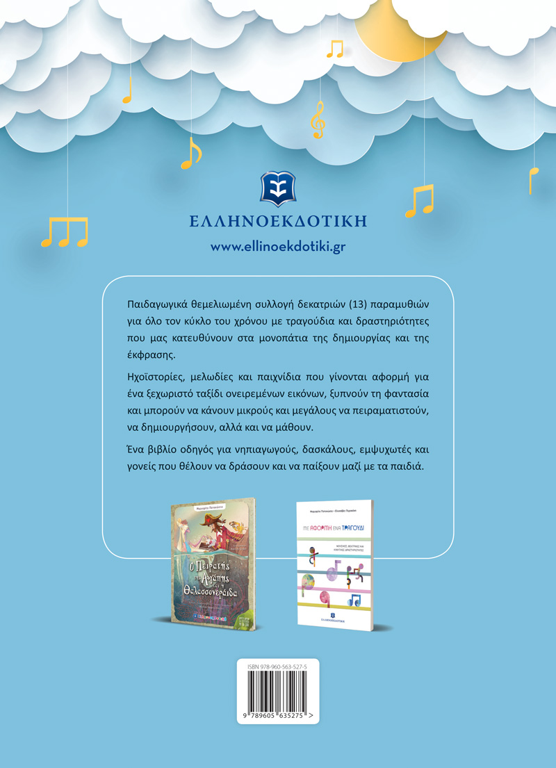 Παιδαγωγικά θεμελιωμένη συλλογή δεκατριών (13) παραμυθιών για όλο τον κύκλο του χρόνου με τραγούδια και δραστηριότητες που μας κατευθύνουν στα μονοπάτια της δημιουργίας και της έκφρασης. Ηχοϊστορίες, μελωδίες και παιχνίδια που γίνονται αφορμή για ένα ξεχωριστό ταξίδι ονειρεμένων εικόνων, ξυπνούν τη φαντασία και μπορούν να κάνουν μικρούς και μεγάλους να πειραματιστούν, να δημιουργήσουν, αλλά και να μάθουν.Ένα βιβλίο οδηγός για νηπιαγωγούς, δασκάλους, εμψυχωτές και γονείς που θέλουν να δράσουν και να παίξουν μαζί με τα παιδιά.