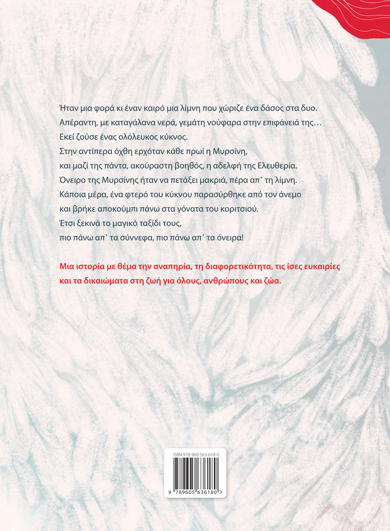 Ήταν μια φορά κι έναν καιρό μια λίμνη που χώριζε ένα δάσος στα δυο.Απέραντη, με καταγάλανα νερά, γεμάτη νούφαρα στην επιφάνειά της…Εκεί ζούσε ένας ολόλευκος κύκνος.Στην αντίπερα όχθη ερχόταν κάθε πρωί η Μυρσίνη,και μαζί της πάντα, ακούραστη βοηθός, η αδελφή της Ελευθερία.Όνειρο της Μυρσίνης ήταν να πετάξει μακριά, πέρα απ’ τη λίμνη.Κάποια μέρα, ένα φτερό του κύκνου παρασύρθηκε από τον άνεμοκαι βρήκε αποκούμπι πάνω στα γόνατα του κοριτσιού.Έτσι ξεκινά το μαγικό ταξίδι τους,πιο πάνω απ’ τα σύννεφα, πιο πάνω απ’ τα όνειρα!