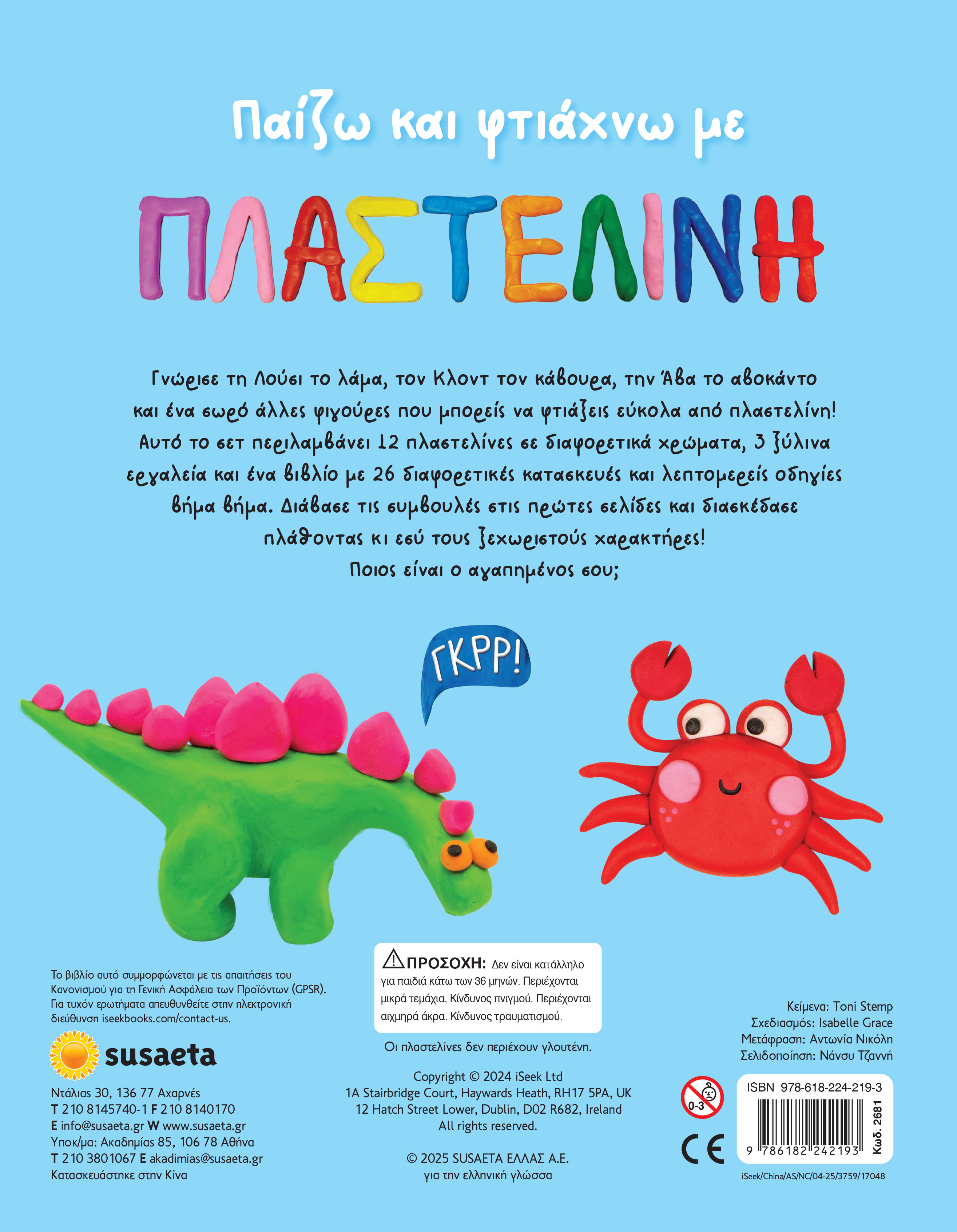 Γνώρισε τη Λούσι το λάμα, τον Κλοντ τον κάβουρα, την Άβα το αβοκάντο και ένα σωρό άλλες φιγούρες που μπορείς να φτιάξεις εύκολα από πλαστελίνη! Αυτό το σετ περιλαμβάνει 12 πλαστελίνες σε διαφορετικά χρώματα, 3 ξύλινα εργαλεία και ένα βιβλίο με 26 διαφορετικές κατασκευές και λεπτομερείς οδηγίες βήμα βήμα. Διάβασε τις συμβουλές στις πρώτες σελίδες και διασκέδασε πλάθοντας κι εσύ τους ξεχωριστούς χαρακτήρες. Ποιος είναι ο αγαπημένος σου;